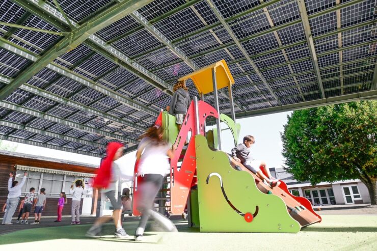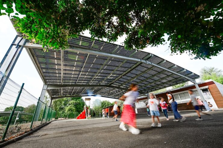 Une centrale qui produit 360 MWh d’énergie verte par an, tout en offrant ombre et protection aux enfants et habitants.