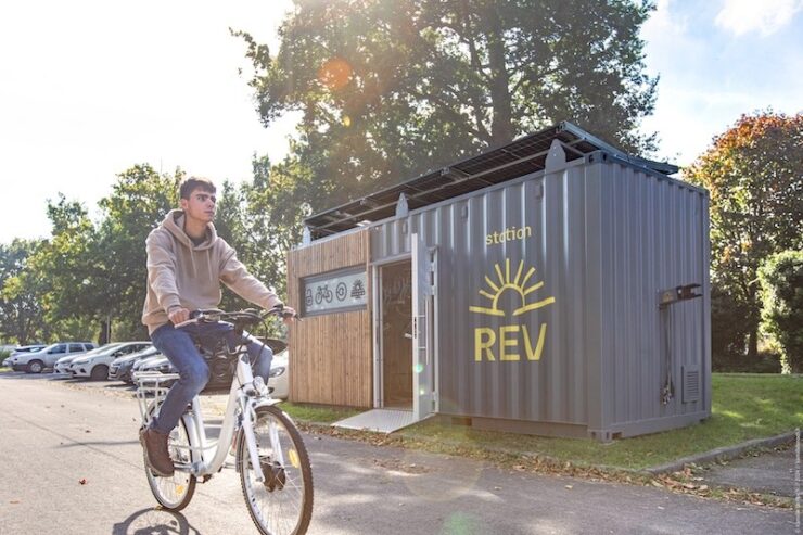Au siège de SeeYouSun, à Cesson-Sévigné, les équipes disposent désormais d’une station vélo solaire, autonome en énergie. Aménagée dans un conteneur maritime réemployé par StationREV, elle associe sécurité, confort et innovation. L’accès est entièrement sécurisé grâce à un système Bluetooth relié à l’AppliREV. L’énergie est produite sur place par une centrale photovoltaïque de 3 kWc, stockée dans une batterie de 5 kWh qui garantit son autonomie. La station offre 18 emplacements vélos ainsi que 12 prises 230 V, qui permettent de recharger facilement vélos électriques et accessoires.