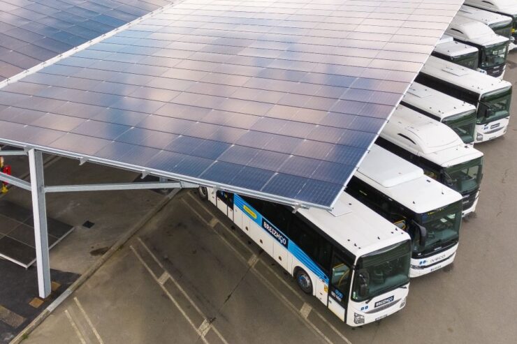 À Noyal-Châtillon-sur-Seiche, près de Rennes, la régie régionale Illevia, opérateur du réseau BreizhGo, équipe son site d’exploitation d’ une très grande ombrière photovoltaïque. Cette installation produit 550 MWh d’électricité décarbonée par an et abrite les bornes d’avitaillement au biogaz utilisées pour la recharge des bus du dépôt.