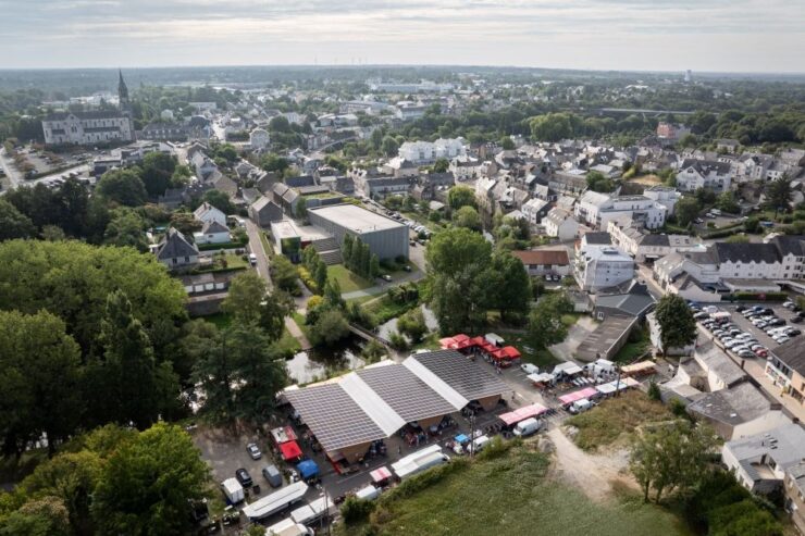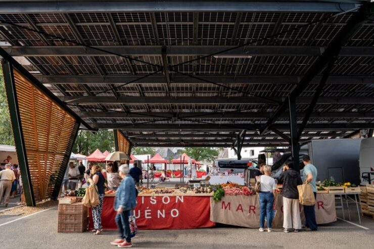 Chaque lundi matin, le marché prend vie sous une halle pas comme les autres : une halle solaire, où habitants et producteurs locaux se retrouvent à l’abri, protégés par 3 ombrières photovoltaïques conçues, construites et financées par SeeYouSun avec son partenaire local la Sem EnR44.