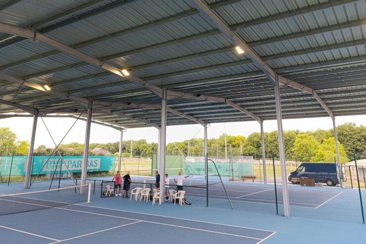 Les infrastructures couvertes offrent un confort de jeu optimal : pratique par tous les temps, protection contre la chaleur et la pluie, éclairage intégré et possibilité d’ajouter un espace de convivialité ou un club house.