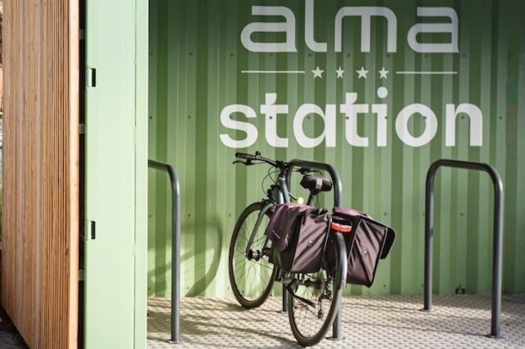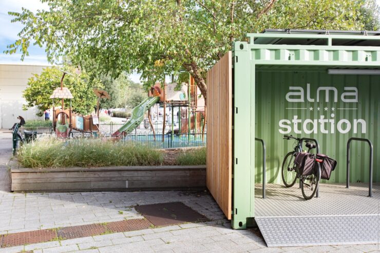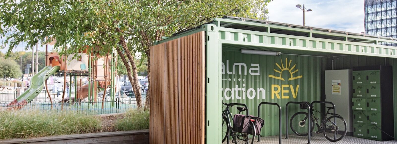 Installée devant le centre commercial Alma, cet ancien conteneur maritime a été réhabilitée en station vélo autonome en électricité. Conçue par l’entreprise cessonnaise StationREV, elle offre un espace de stationnement sécurisé pour les vélos et trottinettes, destiné aussi bien aux visiteur.euses qu’aux commerçant.es.