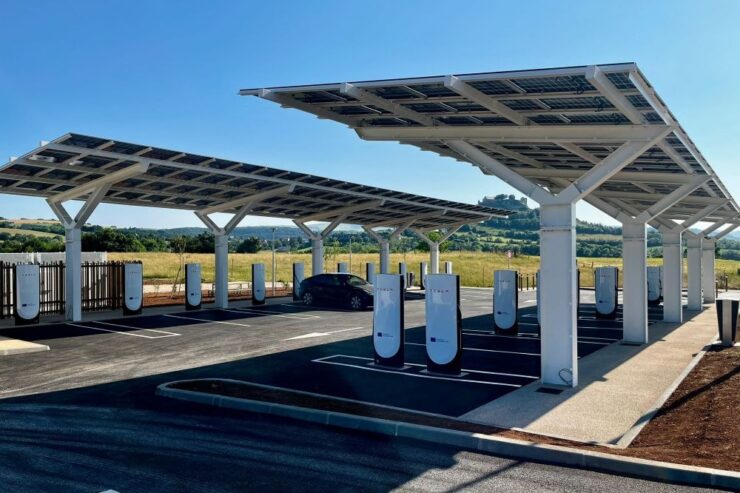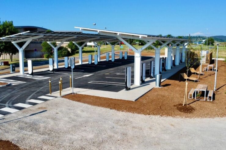 Une aire qui accueille désormais 12 bornes de recharge pour véhicules électriques, directement alimentées par l’énergie solaire produite sur place.